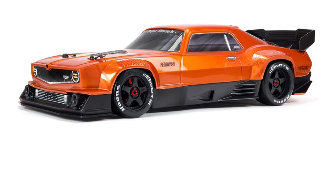 Built for fast street runs and aggressive all-road bashing, the ARRMA 1/7 Felony 6S BLX Street Bash delivers a bold muscle-car look with the kind of power that suits wide open spaces. It’s a ready-to-run setup with transmitter and receiver included, making it a practical choice for drivers who want a large-scale car and prefer choosing their own batteries. With its eye-catching orange finish, the ARRMA 1/7 Felony 6S BLX Street Bash is designed to turn parking lots into a playground.