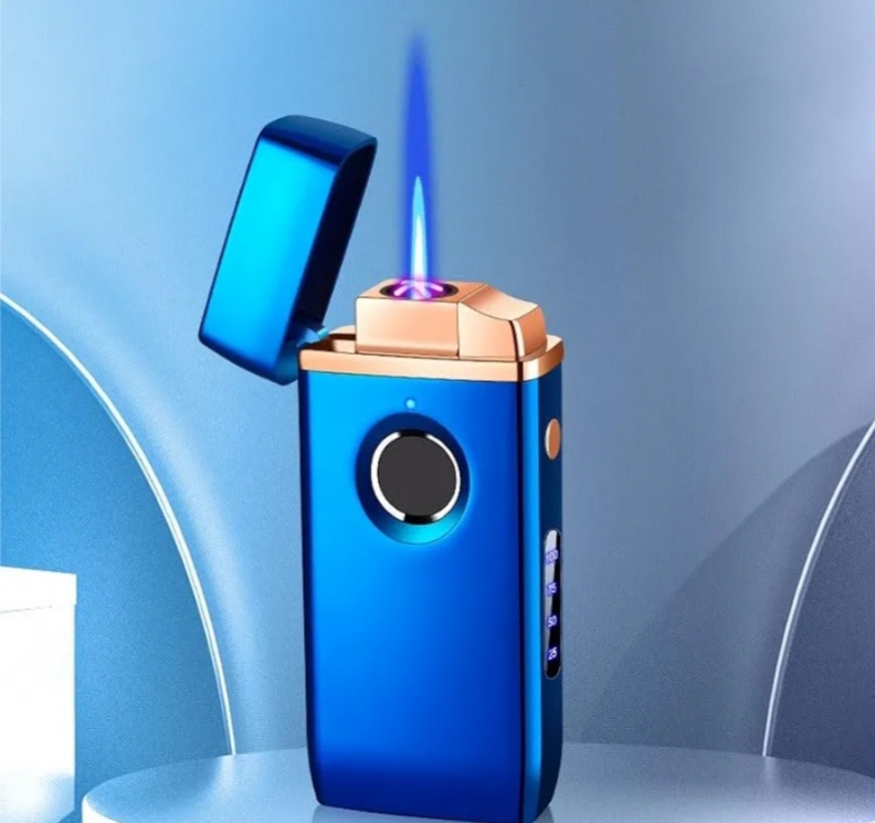 This product is a dual-purpose gas-electric lighter from HUZHUAN, equipped with fingerprint technology for extra security. It combines a modern electric ignition with a powerful refillable gas flame. The lighter features a sleek design with an LED display for power level and a transparent gas tank to easily check the remaining fuel. It is suitable for daily use, lighting cigarettes or candles, and also makes an ideal practical and stylish gift for men.