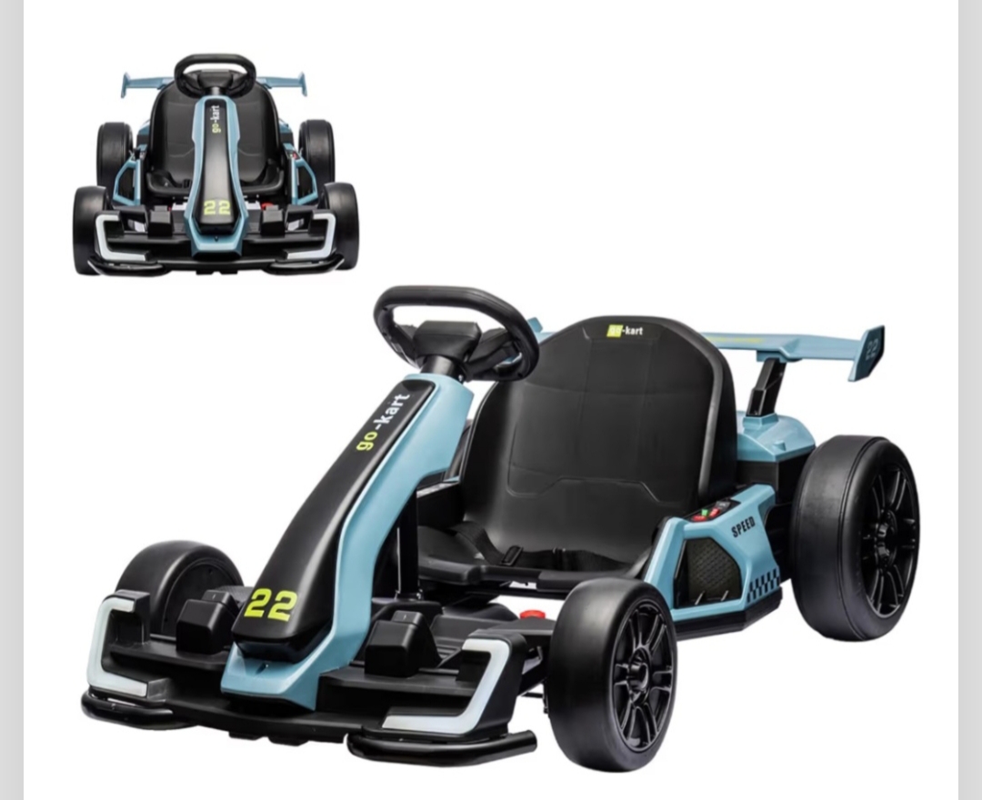 This is a 24-volt electric go-kart designed for children. It features dual motors that provide smooth drifting performance, an adjustable seat, LED lights, and entertainment functions. It offers a fun and safe outdoor driving experience for kids aged approximately 6 to 15 years.