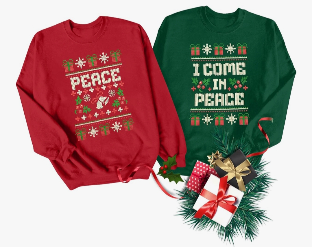 These playful I Come in Peace Peace Sweatshirts are designed for couples who want to share a festive sense of humor during the holidays. With one top reading “I Come in Peace” and the other simply “Peace,” this matching set brings a fun twist to Christmas outfits while keeping things cozy and casual for winter gatherings.