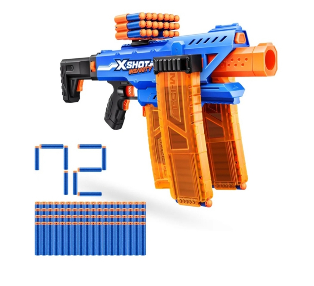 This is the XSHOT Insanity Motorized Clip Mania Dart Blaster, a fully motorized dart blaster toy from the brand ZURU, designed for outdoor play and competitive fun with friends and family. It features a motorized firing system that launches darts quickly without manual effort and comes with 72 Air Pocket Technology darts for enhanced performance.